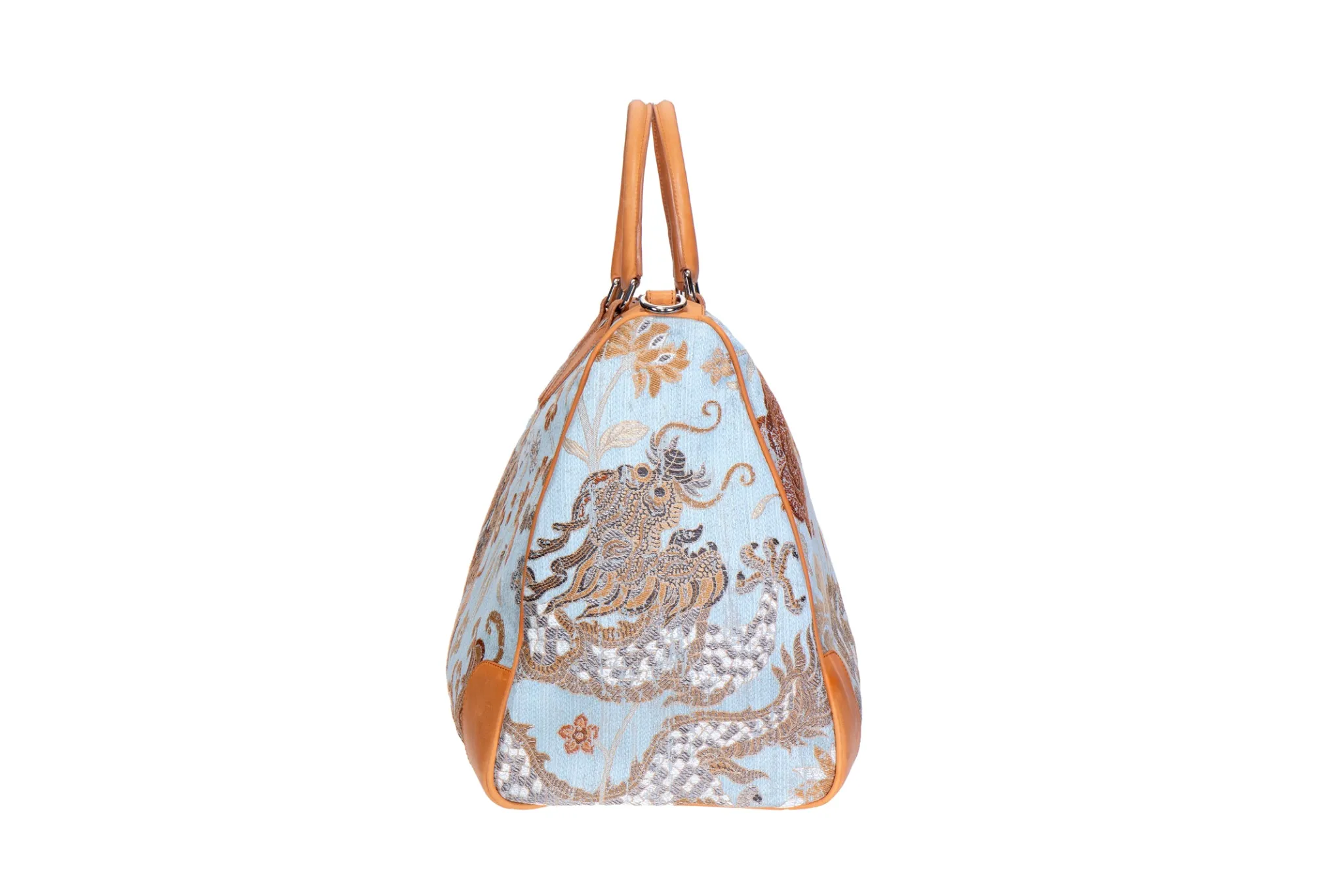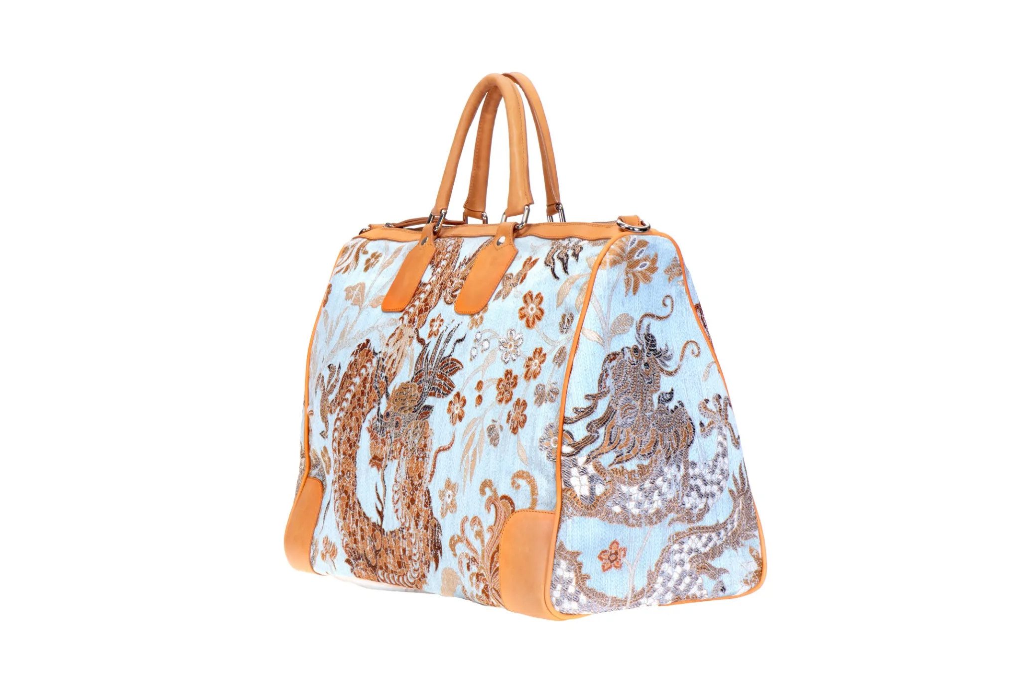 Our Dragon weekender features the silk brocade with leather detailing.
