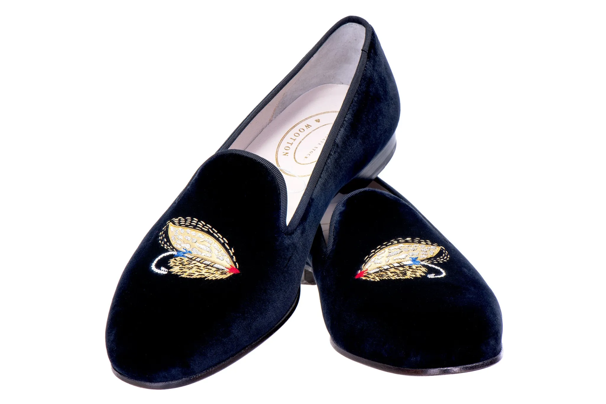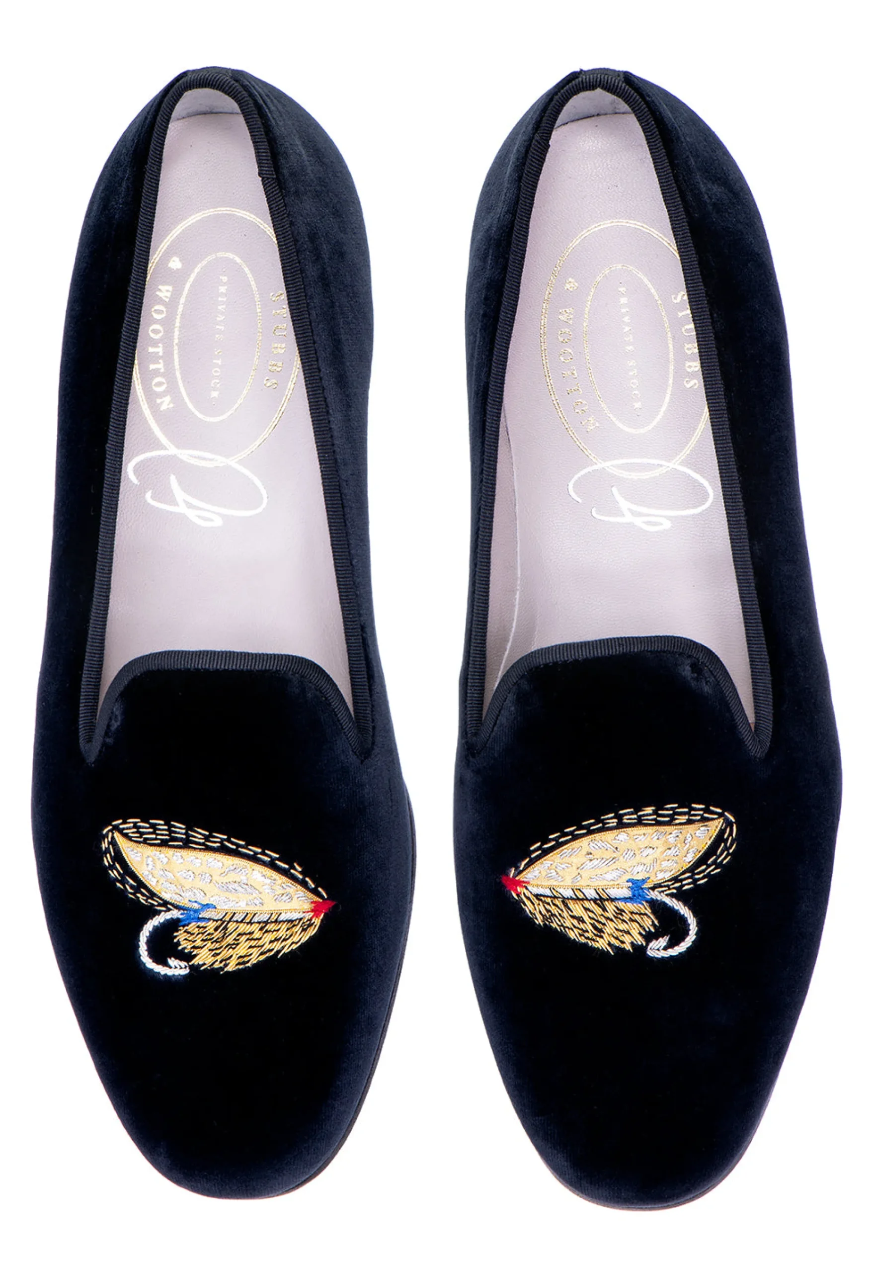 Our Fly PS slipper features the finest Midnight Blue Sea Island Cotton-Velvet Upper with a matching Grosgrain Trim. Featuring our Fly motif, Hand-Embroidered in London using gold wire.