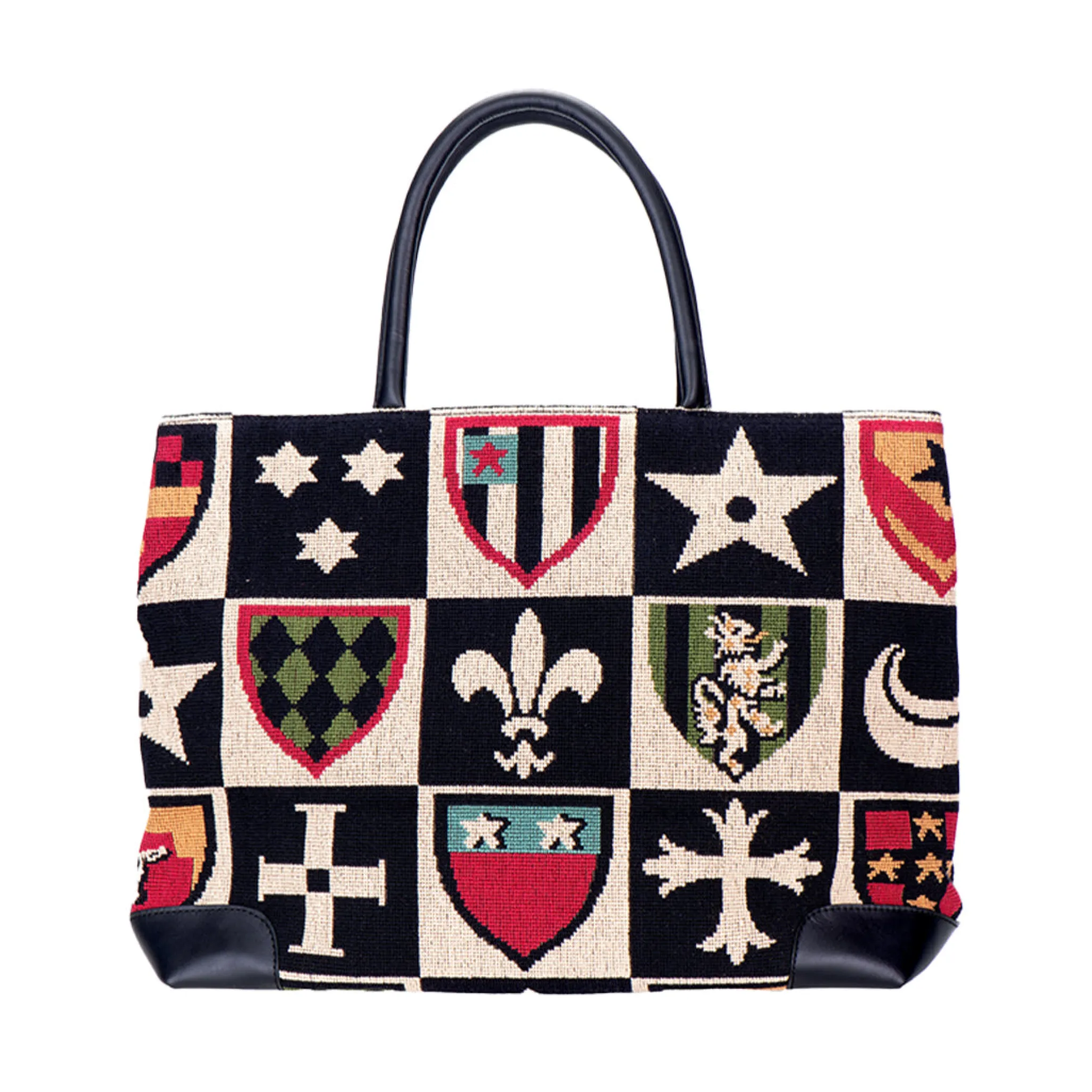 Our Crest Needlepoint Tote features a Patterned Needlepoint with Black leather detailing. Perfect for day trips and overnight stays!