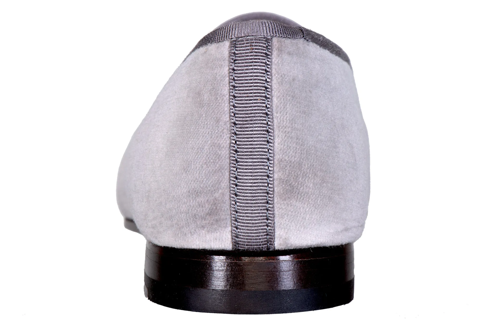 Our Kintsugi Dove slipper features a rich cotton velvet fabric with a tonal gray grosgrain adorned with our gold filament embroidery.
